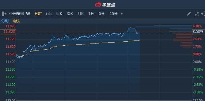 獲悉,小米集團-W(01810)獲瑞銀首予“買入”評級,目標價看高至13.2港元。截至14時21分,漲3.5%,報價11.82港元,成交額12.76億。