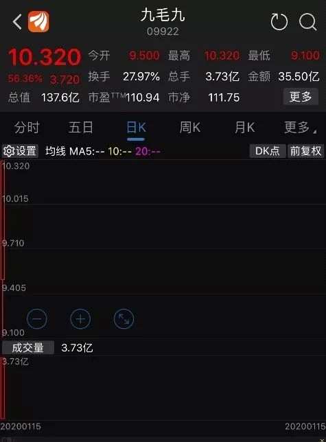 截至15日收盤(pán),九毛九上市首日股價(jià)大漲56.36%,報(bào)10.32港元,成交額達(dá)35.49億港元,市值為137.61億港元。
