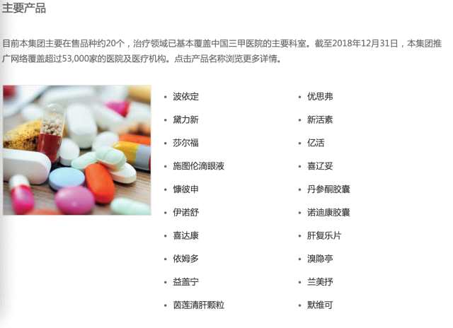 康哲藥業(yè)官網(wǎng)信息,公司聚焦在中國處方藥產(chǎn)業(yè)鏈最核心的兩個環(huán)節(jié)——創(chuàng)新產(chǎn)品研發(fā)與專業(yè)學(xué)術(shù)推廣。目前集團(tuán)主要在售品種約20個,治療領(lǐng)域已基本覆蓋中國三甲醫(yī)院的主要科室。