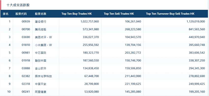 港股通(滬)十大活躍成交股