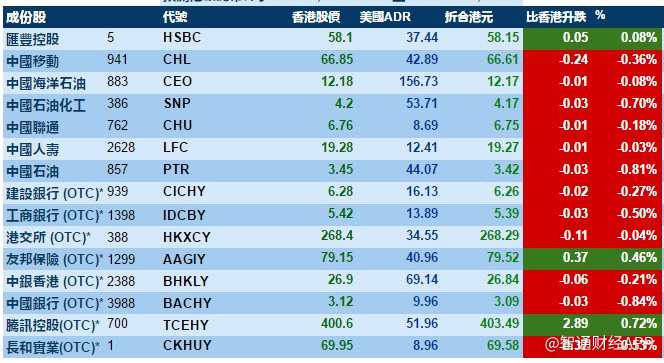 摘要: 美股標指和納指齊創(chuàng)新高,港股ADR指數(shù)全日僅大致持平,按比例計算,收報27253點,微升12點。大型藍籌靠穩(wěn),匯豐控股收報58.15元,較港收市升0.05元;騰訊控股收報403元,較港收市升2.89元