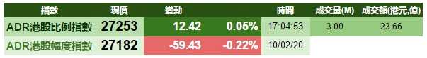 美股標指和納指齊創(chuàng)新高,港股ADR指數(shù)全日僅大致持平,按比例計算,收報27253點,微升12點。