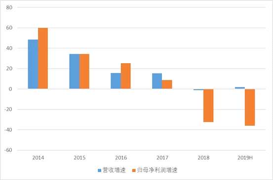 近年來,周黑鴨營收增速及歸母凈利潤增速呈逐年下滑趨勢。截至2019年上半年,公司營業(yè)總收入同比增速為1.87%,扣非歸母凈利潤同比增速更是由正轉負,掉到-36.06%。受此影響,周黑鴨股價在去年下半年很長一段時間內(nèi)都在底部盤整。