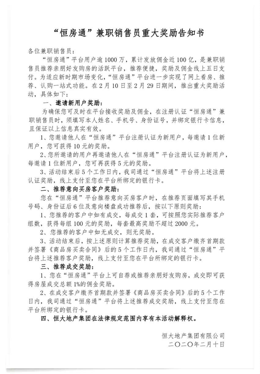 譬如,若客戶自購,定金5000元轉(zhuǎn)為房款,額外享受房屋總價(jià)減20000元;若推薦他人購買,可獲1%傭金及10000元獎(jiǎng)勵(lì),定金全額可退;若第三方購買該房源,恒大將返還定金并給予5000元補(bǔ)償金;若預(yù)定房源5月10日前未被成功銷售,定金將于5個(gè)工作日內(nèi)返還;恒房通推薦獎(jiǎng)勵(lì),每推薦 1 個(gè)新客戶獎(jiǎng)勵(lì)100 元,最高獎(jiǎng)勵(lì) 500 元。