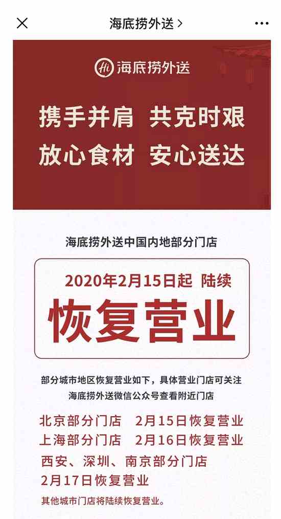2月15日,海底撈外送官方微信發(fā)布公告,自2月15日起,海底撈外送中國內(nèi)地部分門店將陸續(xù)恢復(fù)營業(yè),同時(shí)全面升級“安心送”和“無接觸配送”服務(wù)。
