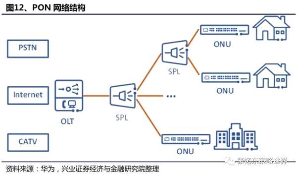 固網(wǎng)接入一般采用PON,光模塊消耗量較大。PON(Passive Optical Network,無源光網(wǎng)絡)是指利用無源設備搭建而成的光網(wǎng)絡,其中無源設備指不需額外電源的電子設備,不涉及到信號的轉換以及放大;相較于有源設備,無源設備的故障率低,可靠性高,一般使用壽命較長,維護成本較低。PON網(wǎng)絡主要由光線路終端OLT(Optical Line Terminal),光分配網(wǎng)絡ODN(Optical Distribution Network)和光網(wǎng)絡單元/終端ONU/ONT(Optical Network Unit/Optical Network Terminal)構成。