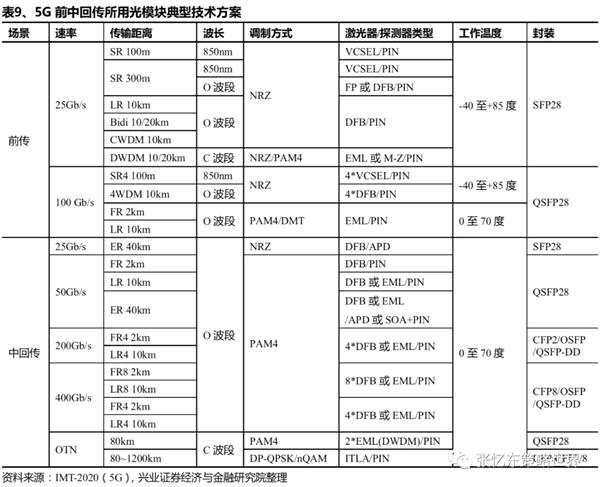 此外,根據(jù)IMT-2020(5G)推進組給出的技術方案,光模塊要求如下:在無線接入側采用10G/25G/100Gb/s灰光或Nx25G/50Gb/s WDM彩光;城域網(wǎng)匯聚層采用100G/200Gb/s灰光或Nx100Gb/s WDM彩光;在城域網(wǎng)核心層以及骨干網(wǎng)采用200G/400Gb/s灰光或Nx100G/200G/400Gb/s WDM彩光。光模塊的規(guī)格較此前的4G網(wǎng)絡(接入側10Gb/s,匯聚層40Gb/s,核心網(wǎng)及骨干網(wǎng)100Gb/s)均有提升。