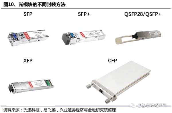 光模塊的封裝主要包括:SFP/SFP+封裝、XFP封裝、QSFP+/QSFP28封裝、CFP封裝等。SFP(Small form-factor pluggable)為小型可插拔型封裝,支持LC光纖連接,速率最高為4Gbps,SFP+在SFP的基礎上速率有所提升,最高速率可達10Gbps.XFP(10GB small form-factor pluggable)指一種10GE小型可插拔光模塊,尺寸比SFP+大。QSFP+(Quad small form-factor pluggable)指四通道小型可熱插拔光模塊,通信速率為40Gbps,尺寸比SFP+大;QSFP28封裝大小與QSFP+相同,支持100Gbps的速率。CFP(Centum form-factor pluggable)是一種基于密集波分復用的新型光模塊標準,同時支持數(shù)通和電信傳輸兩大應用,速率可達100Gbps。