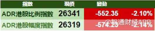 美股持續(xù)第二日下跌,拖累港股ADR指數(shù)全日受壓,按比例計(jì)算,收報(bào)26341點(diǎn),跌552.35點(diǎn)或2.10%。