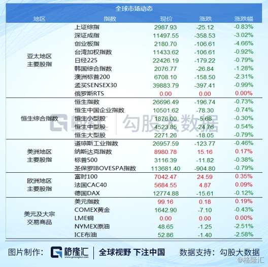 【A股】A股回調(diào),科技股重挫。上證指數(shù)收跌0.83%報(bào)2987.93點(diǎn);深成指跌3.02%;創(chuàng)業(yè)板指跌4.66%。兩市成交額連續(xù)6日超萬億。北向資金連續(xù)4日凈流出。行業(yè)板塊方面,基建板塊大漲,山東路橋等逾10股漲停。新能源汽車概念活躍,佛塑科技、中超控股等多股漲停。房地產(chǎn)板塊異動(dòng),香江控股、上實(shí)發(fā)展等漲停。5G概念股分化,京泉華等多股漲停。口罩概念股分化,【潔特生物(688026)、股吧】、藍(lán)帆醫(yī)療、漫步者大跌。國(guó)產(chǎn)芯片概念大幅殺跌,晶盛機(jī)電等多股跌停。PCB板塊重挫逾,天津普林等多股跌停。光刻膠概念大跌,南大光電等跌停。氮化鎵概念大跌,海特高新等跌停?;ヂ?lián)網(wǎng)金融概念低迷,同花順、指南針跌停。