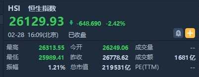 港股收盤(2.28)|恒指收跌2.42%創(chuàng)四個(gè)月新低 九龍倉(cāng)集團(tuán)(00004)復(fù)牌大跌16.55%