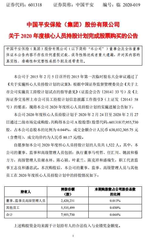 中國(guó)平安:2020年度核心人員持股計(jì)劃完成股票購(gòu)買 共耗資6.38億元