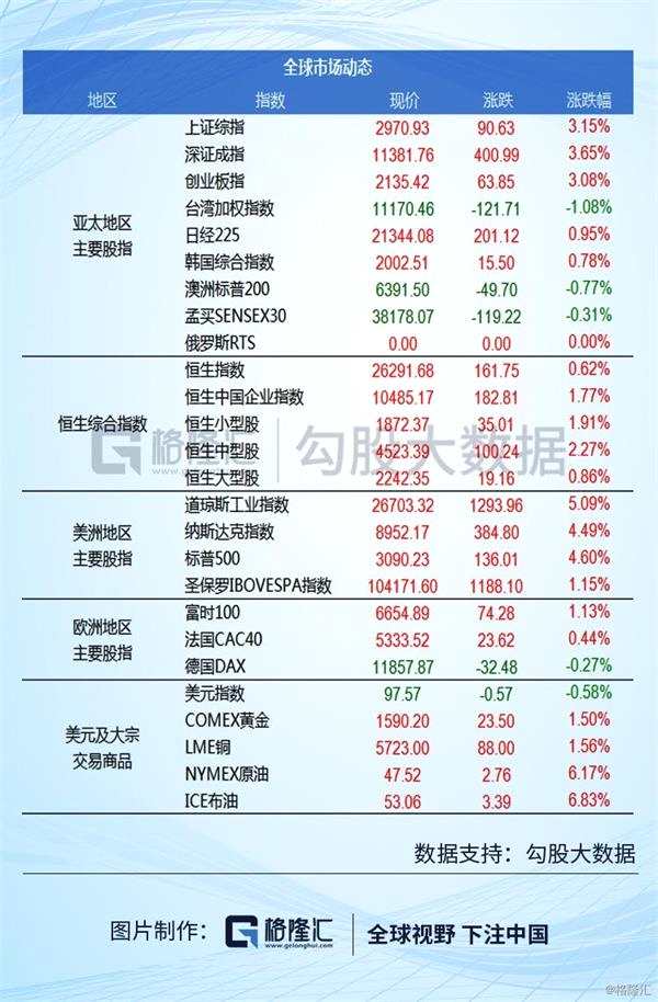 【A股】昨天兩市強(qiáng)勢反彈,滬指填補(bǔ)上交易日向下跳空缺口,收漲3.15%報(bào)2970.93點(diǎn),深成指3.65%報(bào)11381.76點(diǎn),創(chuàng)業(yè)板漲3.08%報(bào)2135.42點(diǎn)。兩市成交額再度破萬,為連續(xù)9日在萬億以上;3639股上漲,213股漲停;北上資金凈流入68億。盤面上,行業(yè)板塊全線收紅,建筑板塊全天強(qiáng)勢大漲居前,中國中鐵、中國鐵建等三十多股漲停;建材板塊大漲緊跟其后,北新建材、華新水泥等十余股漲停;工程機(jī)械、通信設(shè)備、運(yùn)輸設(shè)備等概念大漲靠前。券商股集體上漲,華創(chuàng)安陽漲停,中信證券漲超4%。