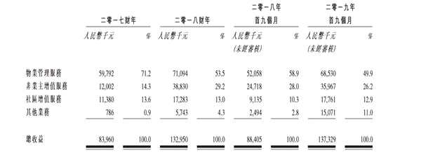 值得關(guān)注的是,在這四條業(yè)務(wù)線中,為營收貢獻力度最大的業(yè)務(wù)是物業(yè)管理服務(wù),次之為非業(yè)主增值服務(wù)。2017年、2018年及2019年前九個月,物業(yè)管理服務(wù)收益分別占總收益約約71.2%、53.5%及49.9%,呈下滑趨勢;而非業(yè)主增值服務(wù)分別占總收益約14.3%、29.2%及26.2%。同時,社區(qū)增值服務(wù)收益分別占總收益約13.6%、 13.0%及12.9%,而余下則為其他業(yè)務(wù)貢獻的收益。