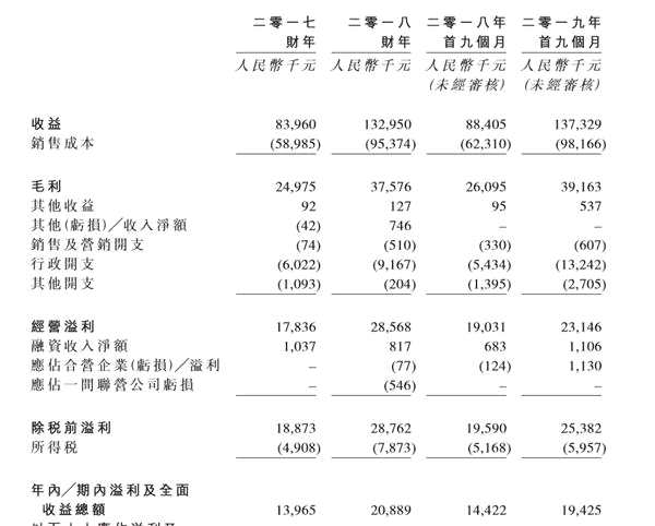 根據(jù)招股書顯示,2017年、2018年以及2019年前9個月,宋都物業(yè)的營業(yè)收入分別為0.84億元(人民幣,下同)、 1.33 億元和1.37億元,同期所對應(yīng)的毛利分別為0.25億元、0.38億元、0.39億元。其中,值得一提的是,2018年的營業(yè)收入較2017年增長58.3%,2019年前9個月與同期相比的增速為55.3%,同期毛利潤的增速分別為50.5%、50.1%,這兩年營收保持穩(wěn)定增長。