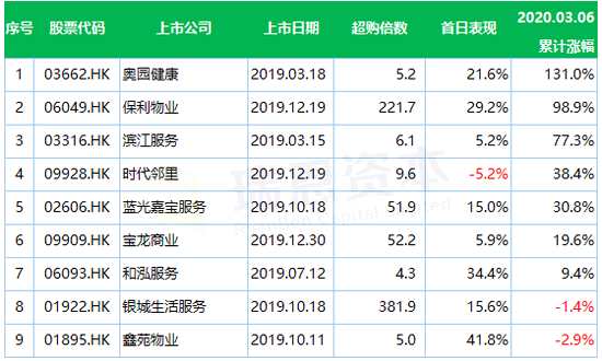 不過值得注意的是,物業(yè)管理新股升值空間大,首日升幅不足3成的物管股,后市則越升越有,2019年上市的 9 只物管新股中,6只至今累計升幅超越首日,部份更累漲逾倍(見表),如奧園健康 (03362.HK) 首掛升21.6%,至今已累升131%,首日升29.2%的保利物業(yè)(06049.HK) ,亦累升98.9%。