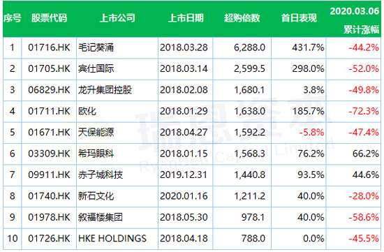 若參考十大‘超購?fù)酢谋憩F(xiàn),首日普遍錄得強勢升幅,不過其后市走勢普遍較首日升勢差,10股中8只至今更已跌穿招股價(見表),如超購6,288倍的毛記葵涌(01716.HK) ,該股首日升逾4.3倍,至今已跌破招股價,累瀉44.2%,超購2,599倍且首掛升3倍的賓仕國際 (01705.HK) ,現(xiàn)亦累跌52%。
