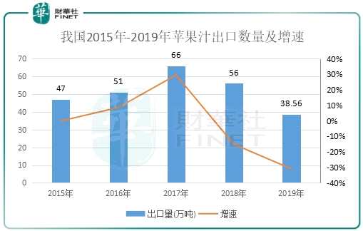在出口方面,我國蘋果汁的出口近兩年來受貿(mào)易摩擦等因素影響增速不斷下行。在2017年達(dá)到頂峰后,2018年及2019年的出口數(shù)量加速下降。2018年及2019年蘋果汁出口分別為56萬噸及38.56萬噸,分別下滑15.15%及31%。