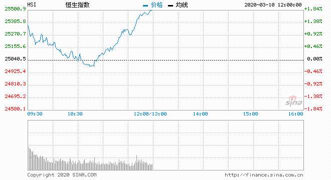 3月10日消息,原油價(jià)格暴跌再加上對(duì)冠狀病毒的擔(dān)憂加劇,3月9日全球市場(chǎng)出現(xiàn)“血崩”,多地市場(chǎng)已經(jīng)或勢(shì)將跌入熊市。標(biāo)普500指數(shù)一度暴跌7%觸發(fā)熔斷機(jī)制,美股暫停交易15分鐘。早間富時(shí)A50大漲3%,恒指期貨漲逾1%。今日早盤,恒指走勢(shì)反復(fù),呈V型走勢(shì)。截至午間收盤,恒生指數(shù)漲1.81%,報(bào)25494.68點(diǎn);國(guó)企指數(shù)漲2.2%,紅籌指數(shù)漲1.22%。