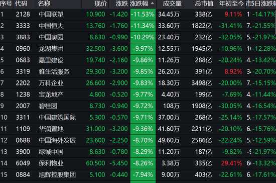 內(nèi)房股集體暴跌,中國恒大大跌11%,中國奧園跌10%,萬科、碧桂園跌近10%。