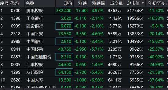 重磅股藍(lán)籌股集體大跌,騰訊控股大跌%,報(bào)價(jià)332.4港元;工商銀行、建設(shè)銀行等跌逾2%,中國銀行跌逾3%,中國移動(dòng)跌近6%,友邦保險(xiǎn)跌逾5%。