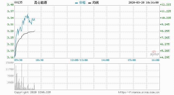 昆侖(00135)升8.91%,報3.3元,最高價為3.34元,最低價為3.09元,主動買盤64%;成交1008萬股,涉資3285.36萬元。