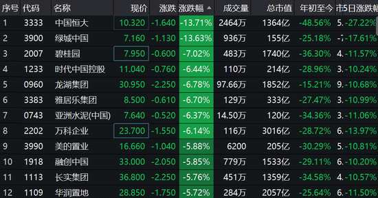 地產(chǎn)股集體走低:中國(guó)恒大跌14% 碧桂園、萬(wàn)科跌逾6%