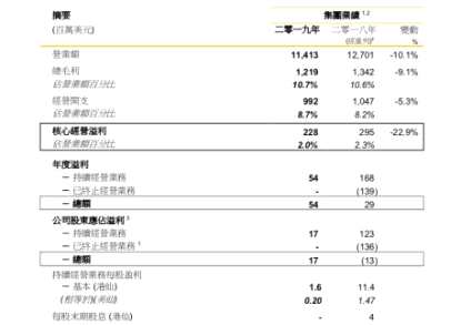3月20日,利豐發(fā)布了2019年度業(yè)績,公告顯示該集團(tuán)于年內(nèi)營業(yè)額為114.13億美元,同比減少10.1%??偯麨?2.19億美元,同比減少9.1%。核心經(jīng)營溢利為2.28億美元,同比減少22.9%。公司股東應(yīng)占溢利為1700萬美元,而上年同期取得虧損1300萬美元。每股基本盈利為0.20美仙,不派息。