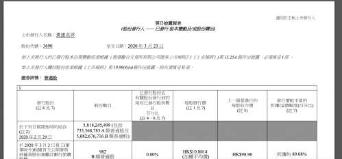 3月23日,美團點評(03690),于2020年3月20日員工(董事除外)根據(jù)首次公開發(fā)售前雇員股份激勵計劃行使購股權(quán)發(fā)行B類普通股3.98萬股,每股發(fā)行價5.2495港元,合折讓約92.75%。