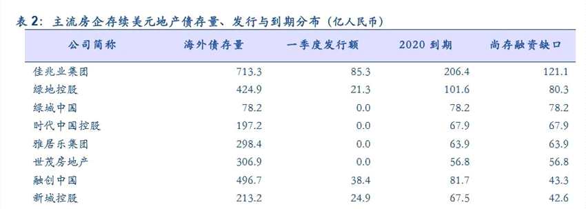 安信證券上述研報還顯示,2020年美元債到期金額靠前的房企也包括綠城中國,其一季度美元債發(fā)行量占全年美元債到期金額的0%,全年尚有凈融資缺口78.2億元,是凈融資缺口最大的房企之一。