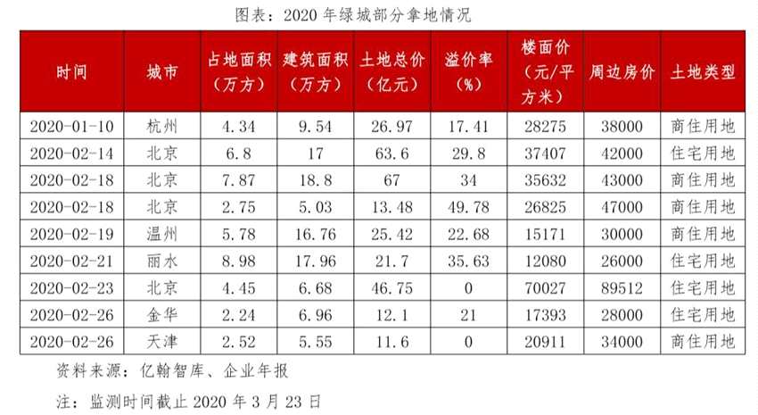 實際上,在拿地方面,綠城中國似乎愈發(fā)激進??硕鸾y(tǒng)計數(shù)據(jù)顯示,2020年1-2月份,綠城新增土地價值312.8億元、貨值585.6億元,位居TOP100房企首位。