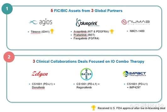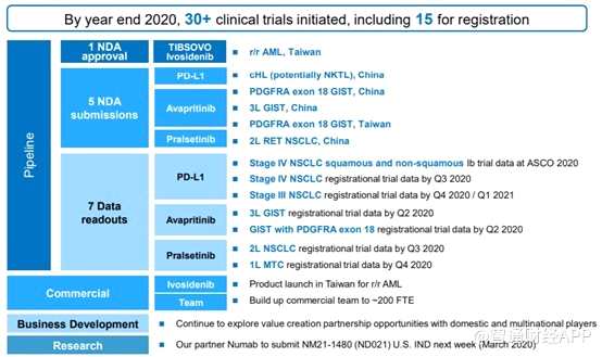 公司獲得美國FDA比準上市的兩款產品,正是與Agios Pharmaceuticals合作研發(fā)的TIBSOVO?(Ivosidenib),以及與Blueprint Medicines合作研發(fā)的AYVAKITTM(avapritinib),同時另一款產品pralsetinib(RET)也由Blueprint Medicines啟動了美國FDA上市滾動申請,這三款藥物均已在中國開展多項注冊型實驗。2019年,公司就TIBSOVO?(Ivosidenib)在中國臺灣提交新藥上市申請,適應癥為復發(fā)難治性急性髓系白血病,預計于2020年獲得批準。2020年3月27日,公司向臺灣衛(wèi)生福利部食品藥物管理署(TFDA)提交AYVAKITTM(avapritinib)針對PDGFRA外顯子18突變胃腸道間質瘤的新藥上市申請,該藥物已于2020年3月9日獲TFDA新藥優(yōu)先審查資格認定。除此之外,公司計劃在2020年上半年為AYVAKITTM(avapritinib)針對同一適應癥在中國大陸遞交新藥上市申請。此外,公司預計于2020年在中國大陸提交AYVAKITTM(avapritinib)針對三線胃腸道間質瘤適應癥以及pralsetinib(RET)針對二線非小細胞肺癌適應癥的上市申請。