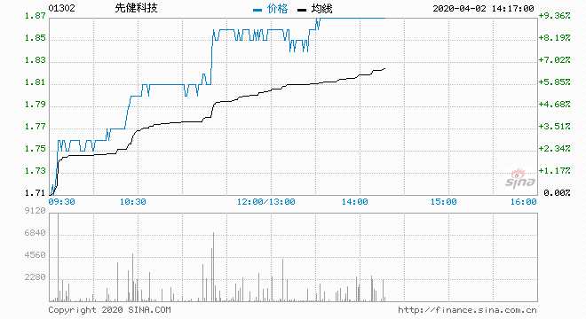 先?。?1302)升11.11%,報(bào)1.9元,最高價(jià)為1.9元,最低價(jià)為1.71元,主動(dòng)買盤75%;成交1215.8萬(wàn)股,涉資2214.85萬(wàn)元。