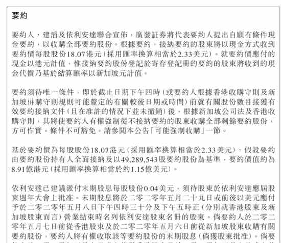 盡管要約人有意將依利安達(dá)私有化,但要約人能否就要約股份行使強(qiáng)制收購權(quán)利視乎要約接納水平是否達(dá)致新加坡公司法項(xiàng)下的規(guī)定水平及香港收購守則規(guī)則2.11的要求是否獲達(dá)成而定。
