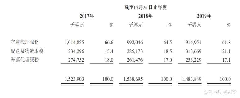 其中,空運(yùn)代理服務(wù)是公司主要收入來源,2017年至2019年度,空運(yùn)代理服務(wù)的收入占比分別為66.6%、64.5%及61.8%。