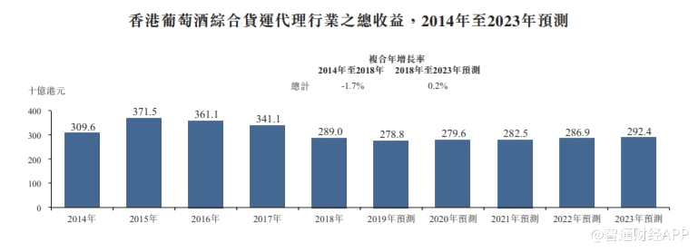 葡萄酒方面,2014年至2018年間,葡萄酒綜合貨運(yùn)代理行業(yè)之總收益于2018年達(dá)289.0百萬港元,復(fù)合年增長率為負(fù)1.7%,其乃主要由于自2015年以來,進(jìn)口葡萄酒及出口葡萄酒數(shù)量減少。預(yù)計(jì)至2023年達(dá)292.4百萬港元,2018年至2023年的復(fù)合年增長率為0.2%。