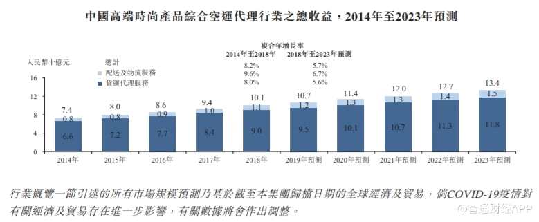 目前,中國消費(fèi)的大多數(shù)奢侈品均自歐洲、美國及日本進(jìn)口。鑒于其相對較高的售價,大多數(shù)奢侈品及相當(dāng)一部分平價奢侈品通過航空運(yùn)輸以確保及時配送并引領(lǐng)時尚潮流。 2014年至2018年間,高端時尚產(chǎn)品綜合空運(yùn)代理行業(yè)的總收益實(shí)現(xiàn)強(qiáng)勁增長,由約74億元增至101億元。2018年至2023年間,預(yù)計(jì)總收益將進(jìn)一步由約101億元增至134億元,復(fù)合年增長率約為5.7%。