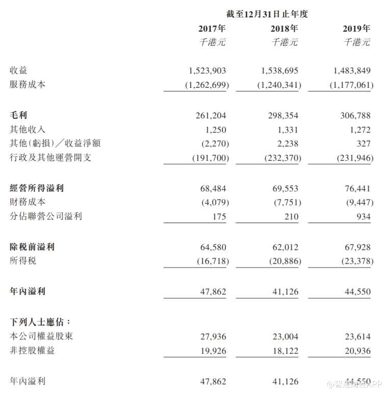 招股書顯示,嘉泓物流2017年至2019年度止,收入分別為15.24億港元、15.39億港元及14.84億港元;毛利潤分別為2.61億港元、2.98億港元及3.07億港元;凈利潤分別為4786.2萬港元、4112.6萬港元及4455萬港元。