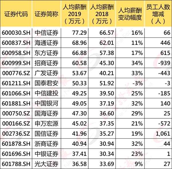 此前,統(tǒng)計,中信證券(600030,股吧)平均薪酬為77萬元位列券商第一。統(tǒng)計方法為,考慮到員工可能在一年中不同月份入職離職,記者以“員工人數(shù)=(上一年度期末+本年度期末)/2”為口徑,將2019年各家券商的總薪酬除以員工人數(shù)粗略計算出員工應(yīng)發(fā)放的平均薪酬。按此方法,新浪港股統(tǒng)計顯示,中金公司員工人數(shù)為7838人,平均薪酬為91.9萬元。海通證券2019年員工數(shù)據(jù)未披露,暫不計算。