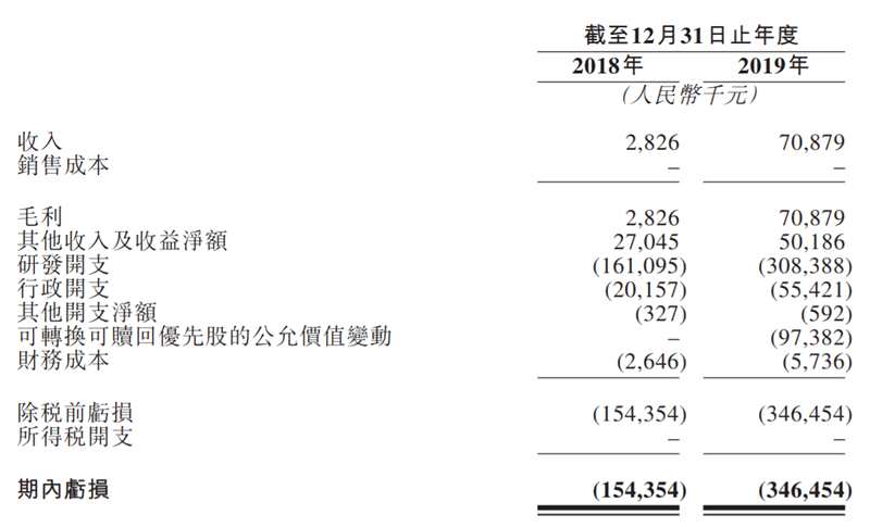 財(cái)務(wù)方面,據(jù)招股書顯示,公司已經(jīng)出現(xiàn)連續(xù)三年虧損。2017年至2019年前三季度分別虧損993.2萬(wàn)元、1.54億元、1.45億元(單位人民幣,下同)。2019年全年虧損擴(kuò)大至3.46億元,收入則按年增至7087.9萬(wàn)元,2018年同期收入錄282.6萬(wàn)元。三年來,公司已累計(jì)虧損近4億元。