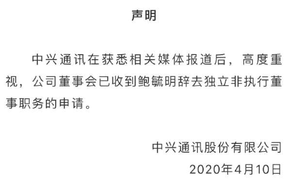 4月10日消息,中興通訊在獲悉相關(guān)媒體報(bào)道后,高度重視,公司董事會(huì)已收到鮑毓明辭去獨(dú)立非執(zhí)行董事職務(wù)的申請(qǐng)。特此聲明。