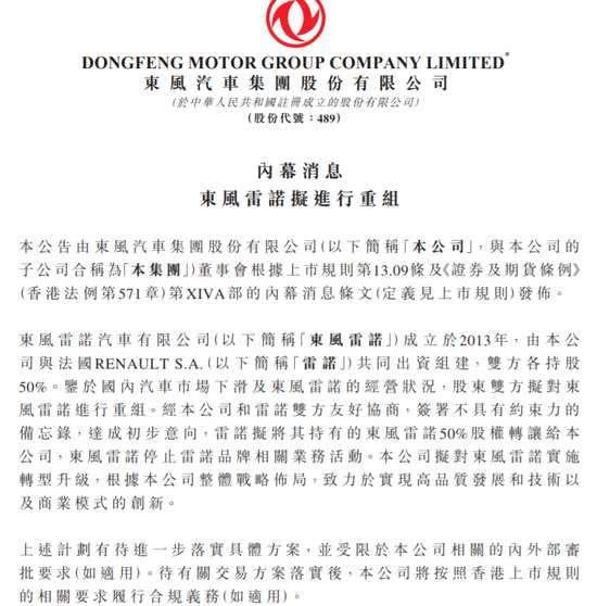 4月14日消息,東風(fēng)汽車(chē)(600006,股吧)集團(tuán)在港交所公告,鑒于國(guó)內(nèi)汽車(chē)市場(chǎng)下滑及東風(fēng)雷諾的經(jīng)營(yíng)狀況,本公司與雷諾雙方擬對(duì)東風(fēng)雷諾進(jìn)行重組。雙方簽署不具有約束力的備忘錄,達(dá)成初步意向,雷諾擬將其持有的東風(fēng)雷諾50%股權(quán)轉(zhuǎn)讓給本公司,東風(fēng)雷諾停止雷諾品牌相關(guān)業(yè)務(wù)活動(dòng)。