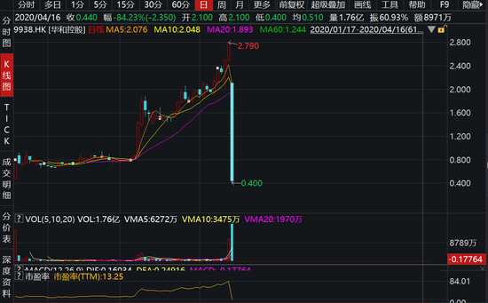 4月16日消息,華和控股閃崩暴跌83.51%,報0.46港元,最新市值4.6億港元,公司股價瞬間遭洗倉,23.5億市值被蒸發(fā)。