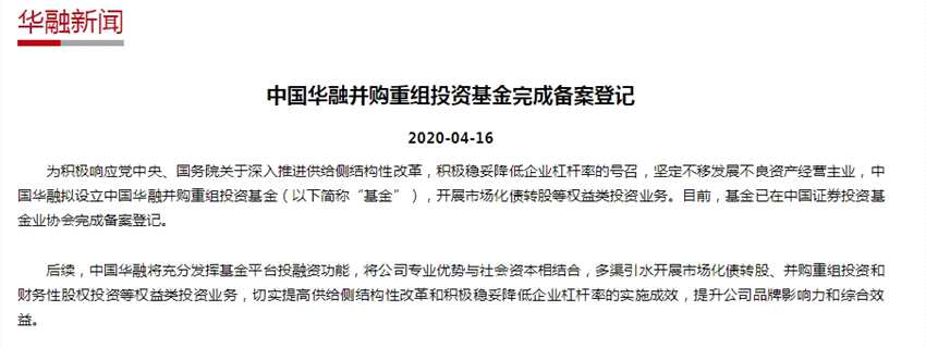 摘要: 據(jù)中國(guó)華融官網(wǎng)16日消息,中國(guó)華融擬設(shè)立中國(guó)華融并購(gòu)重組投資基金(以下簡(jiǎn)稱“基金”),開(kāi)展市場(chǎng)化債轉(zhuǎn)股等權(quán)益類投資業(yè)務(wù)。目前,基金已在中國(guó)證券投資基金業(yè)協(xié)會(huì)完成備案登記。來(lái)源:中國(guó)華融官網(wǎng)中國(guó)華融表示