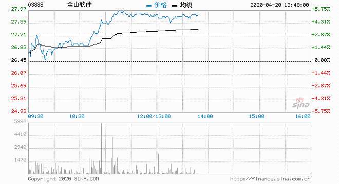 金山軟件(03888)現(xiàn)價(jià)升5.1%,報(bào)27.8元;成交約732萬股,涉資2.00億元。