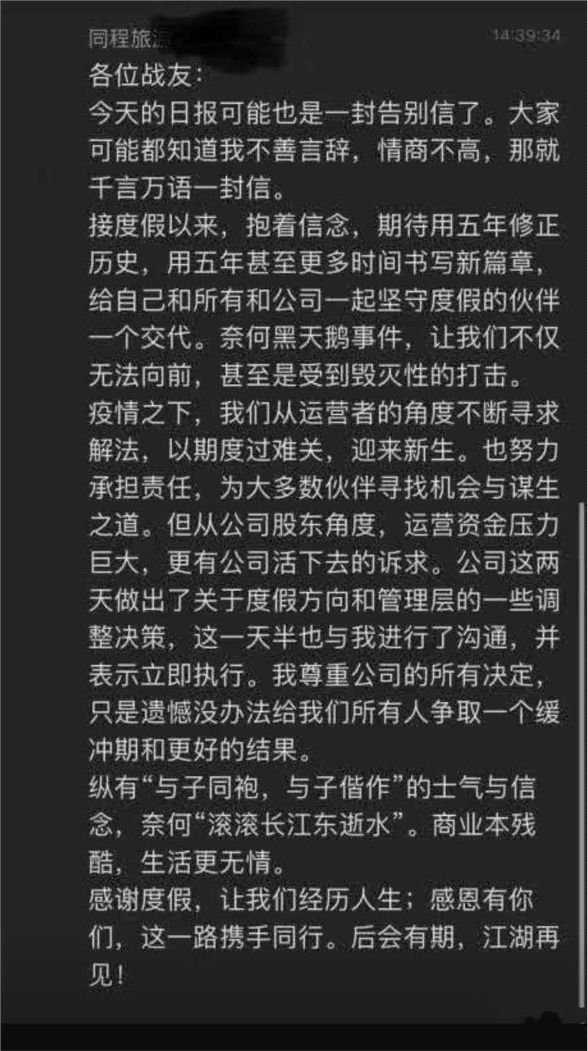楊佳佳在這封內部信中稱:“疫情的黑天鵝事件,讓我們無法向前,甚至是毀滅性打擊。。。。。。從公司股東角度講,運營資金壓力巨大,更有公司活下去的訴求,公司這兩天做出了關于度假方向和管理層的一些調整決策。。。。。。我尊重公司的所有決定,只是遺憾沒辦法給我們所有人爭取一個緩沖期和更好的結果?!?/p>