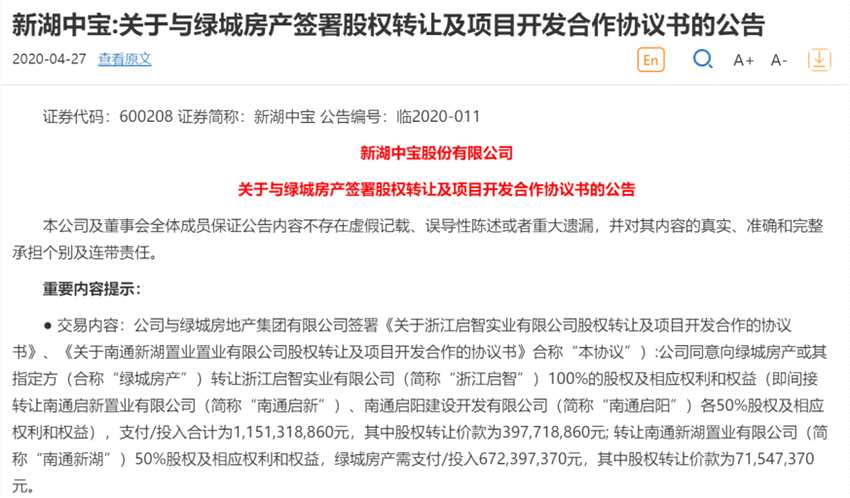 同日,新湖中寶還公告,為共同合作開發(fā)啟東“海上明珠城”項目,公司將向綠城轉(zhuǎn)讓浙江啟智100%股權(quán)及相應(yīng)權(quán)利和權(quán)益(即間接轉(zhuǎn)讓南通啟新置業(yè)有限公司、南通啟陽建設(shè)開發(fā)有限公司各50%股權(quán)),并轉(zhuǎn)讓南通新湖置業(yè)有限公司50%股權(quán),上述項目合計總對價18.23億元。