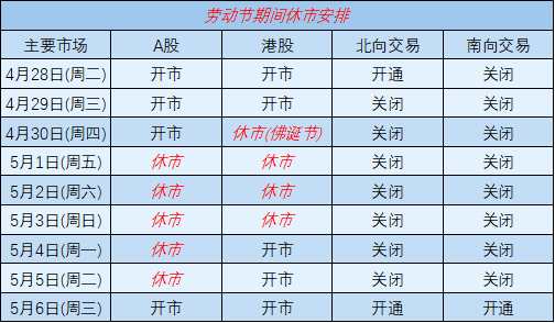 本周北向資金只有2個(gè)交易日,根據(jù)港交所安排,南下交易4月28日(周二)起關(guān)閉,5月6日(節(jié)后周三)恢復(fù)開(kāi)通;北向交易4月29日(周三)起關(guān)閉,5月6日(節(jié)后周三)恢復(fù)開(kāi)通。