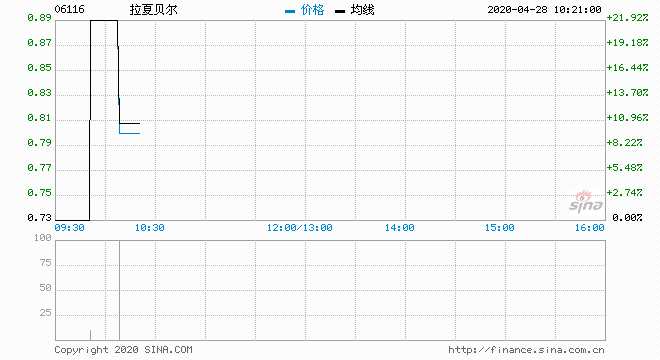 摘要: 拉夏貝爾(603157,股吧)(06116)升19.18%,報0.87元,最高價為0.89元,最低價為0.89元,主動買盤100%;成交1000股,涉資890元。
