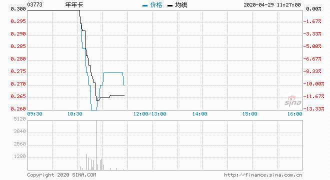 摘要: 年年卡(03773)跌13.33%,報0.26元,最低價為0.255元,創(chuàng)上市新低,最高價為0.3元,主動賣盤99%;成交107.6萬股,涉資28.42萬元.以現(xiàn)價計,該股暫連跌2日,累計跌幅14.7